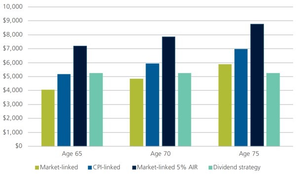Another impact of maintaining the capital is that the dividend strategy does not increase payments at older ages. The comparison to market linked lifetime income streams is shown in Figure 7 which shows that only the market-linked strategy with a 5% AIR has a higher initial payment at age 65, but by age 75, the dividend strategy provides lower payments than any of the other strategies. This demonstrates that a dividend strategy supports a lower lifestyle than a strategy that will consume capital over time. Retirees are unable to maximise the money available to spend through retirement if they do not draw down on their capital.